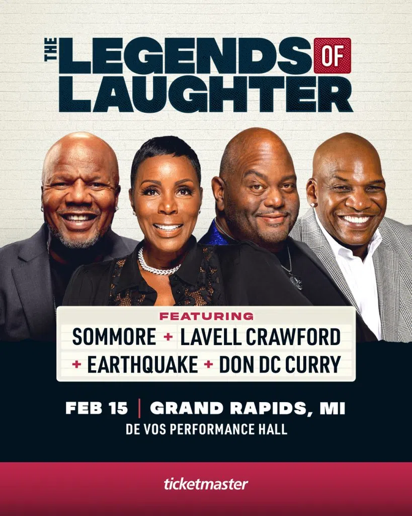 Sommore, Lavell Crawford, Earthquake, and Don DC Curry are bringing “The Legends of Laughter Tour” to DeVos Performance Hall in Grand Rapids on Sunday, February 15, 2026 for a 7 pm show.